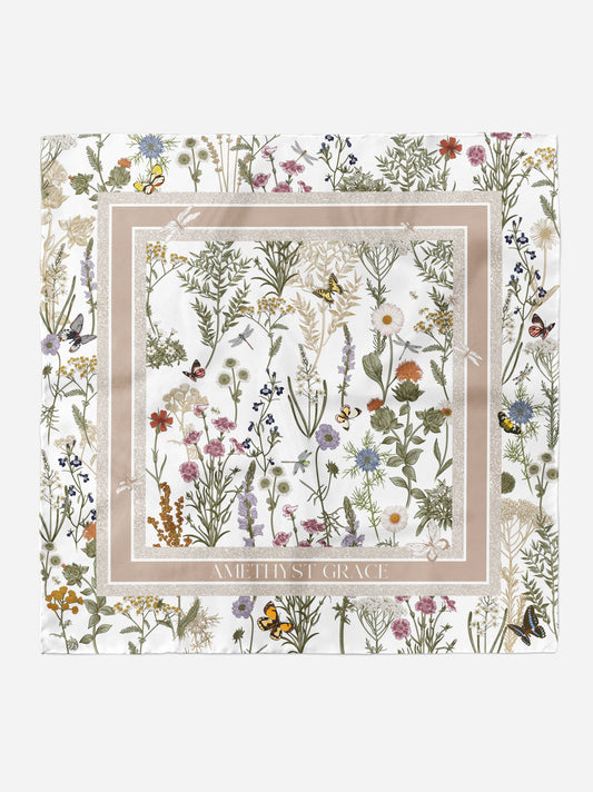 Garden Reverie Square Scarf – Beige & Green – Silk Wool Modal Blend