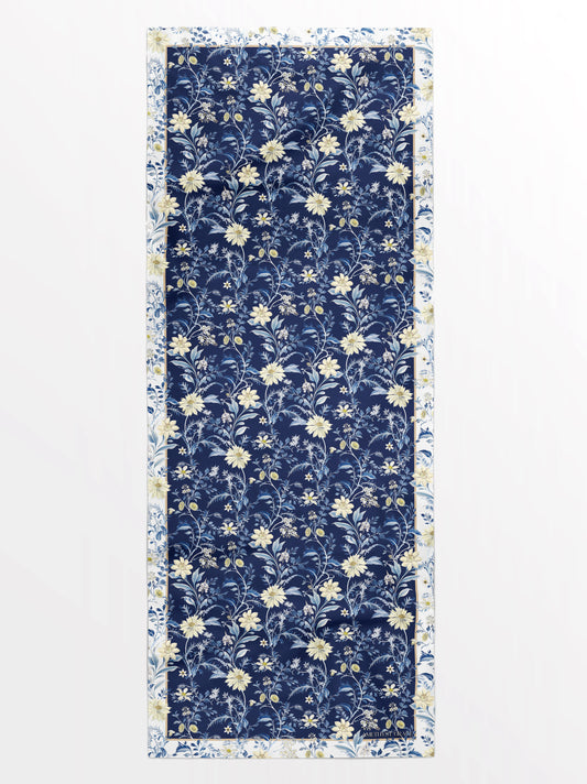 Peach Garden Print Oblong Scarf – Blue & White – Silk Wool Modal Blend