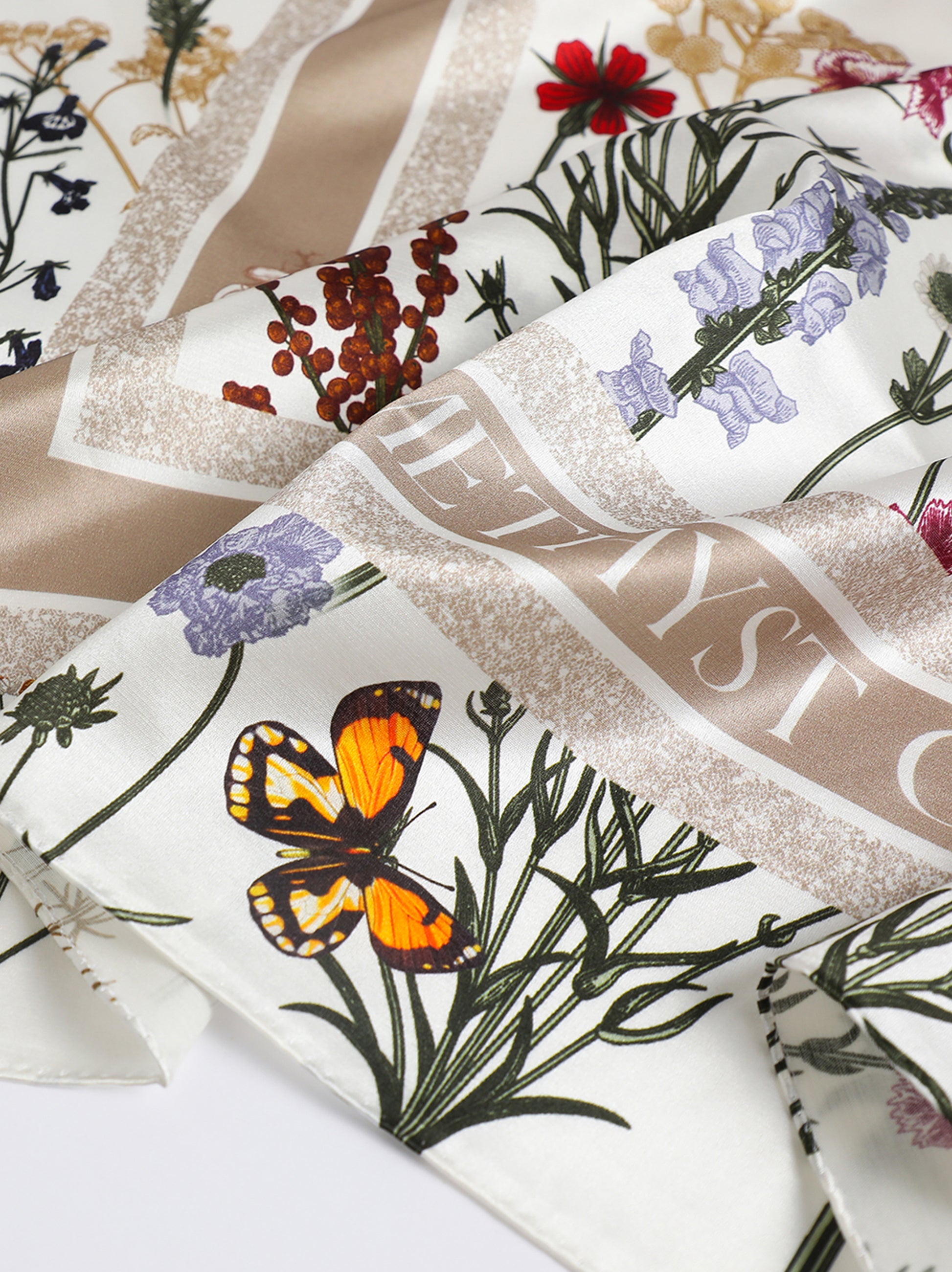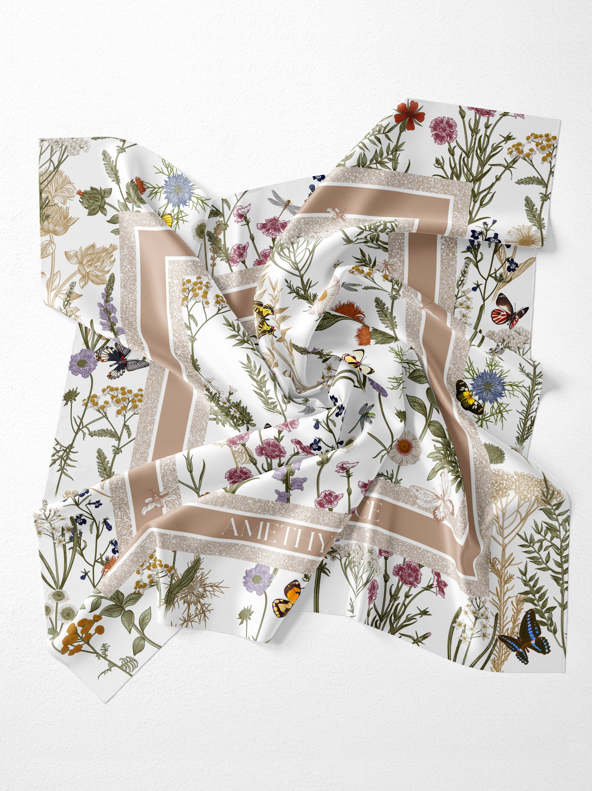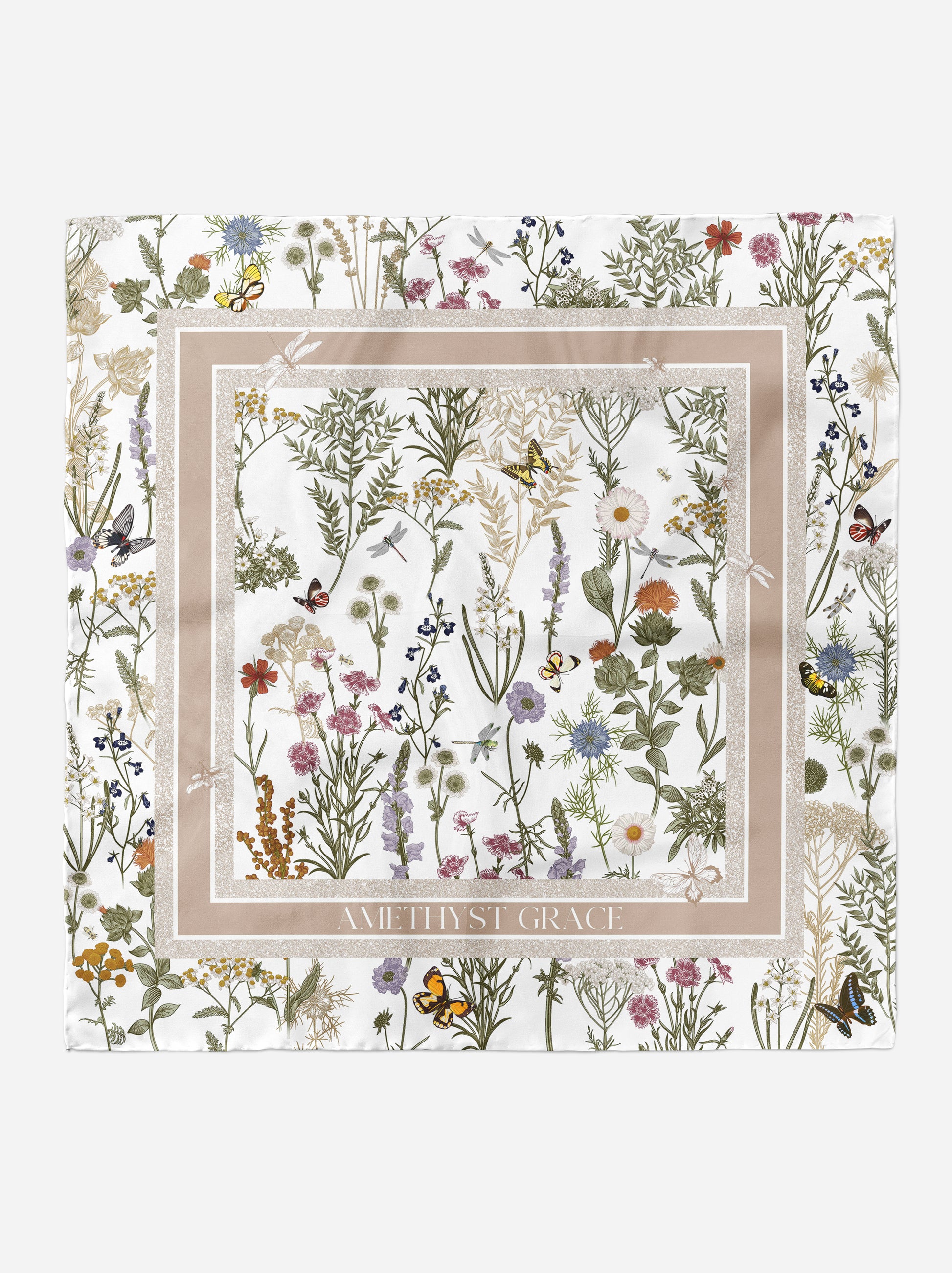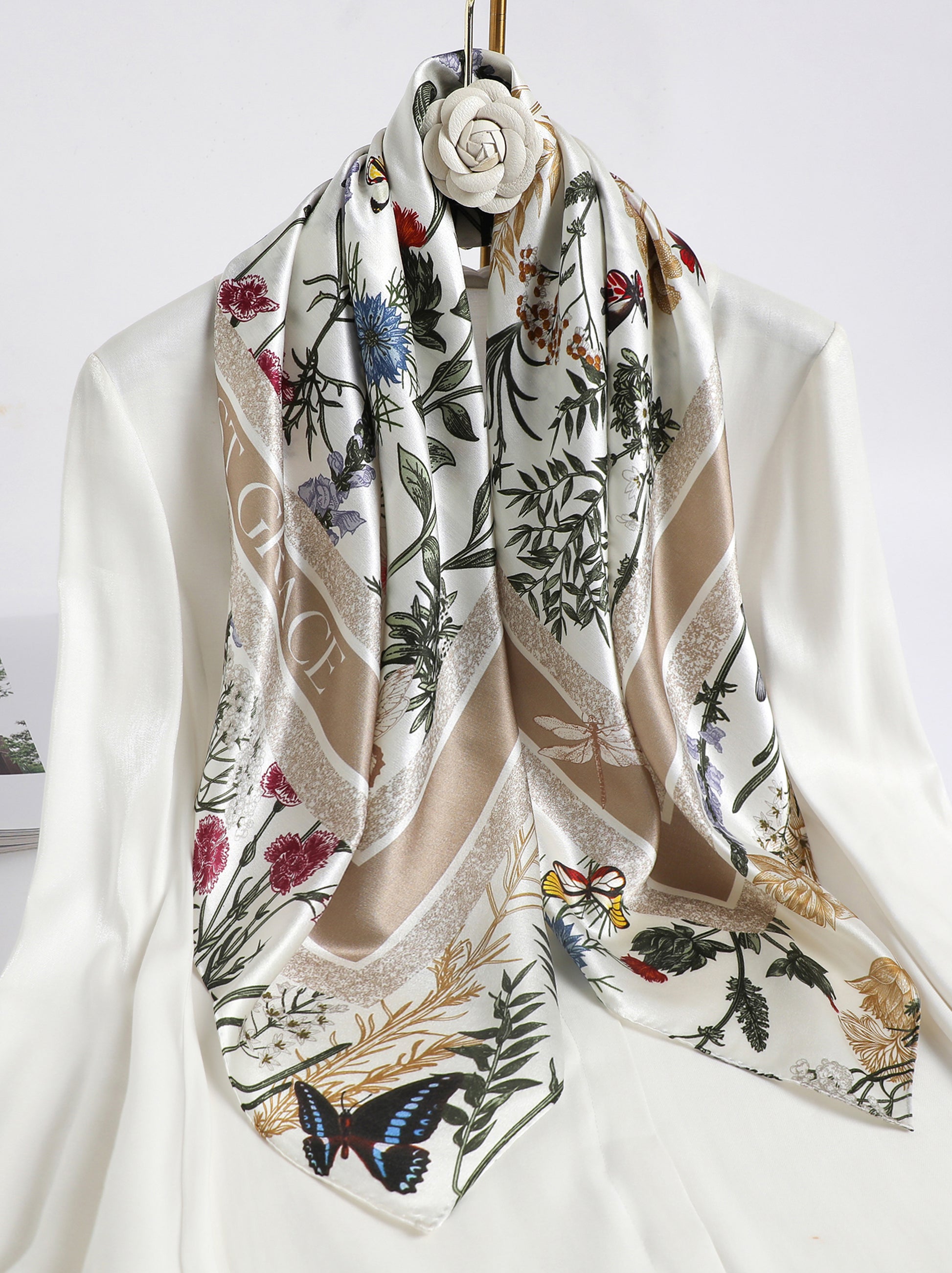 Garden Reverie Square Scarf – Beige & Green – Silk Wool Modal Blend
