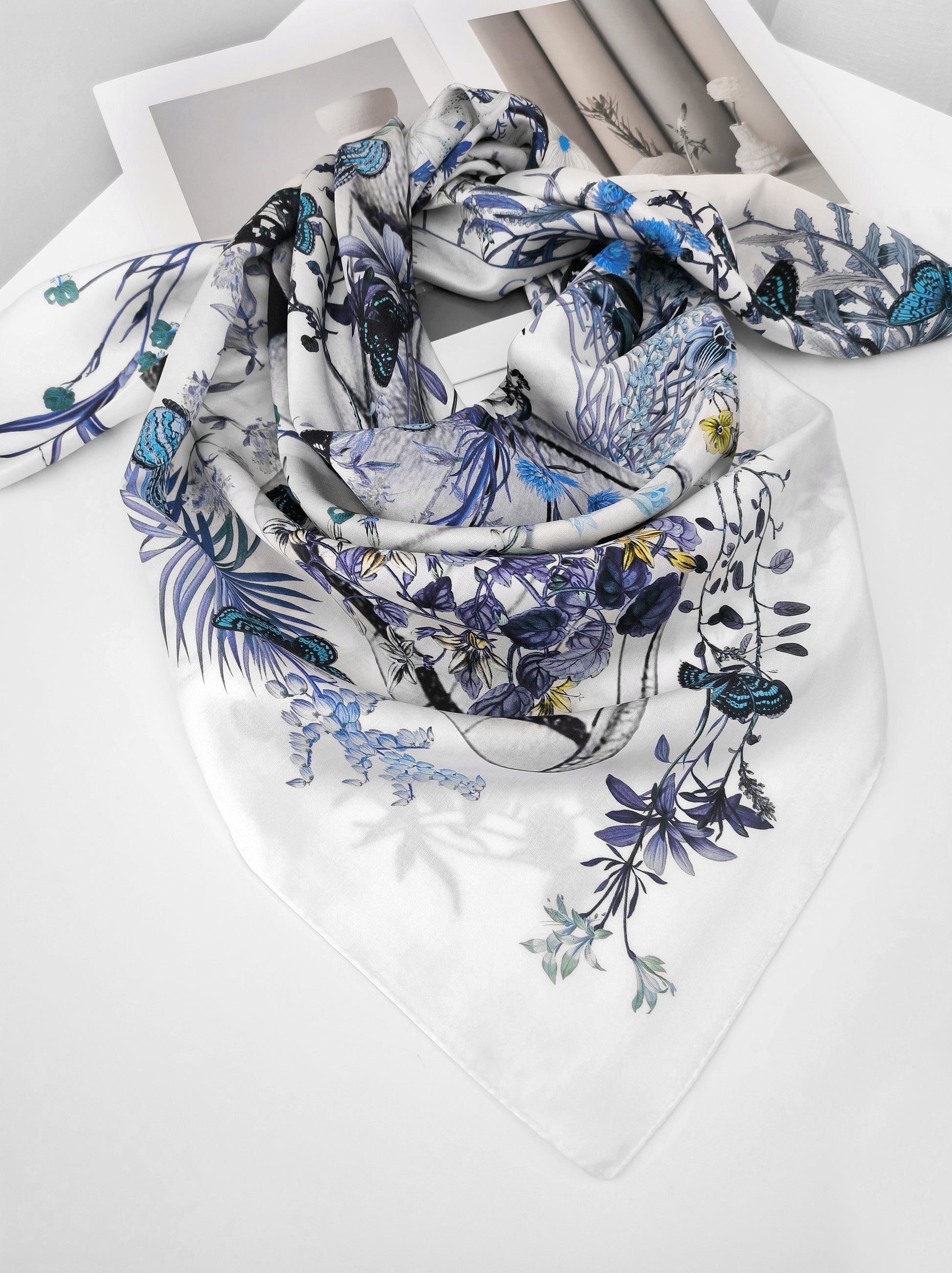 Peach Garden Print Square Scarf – Blue & White – Silk Wool Modal Blend