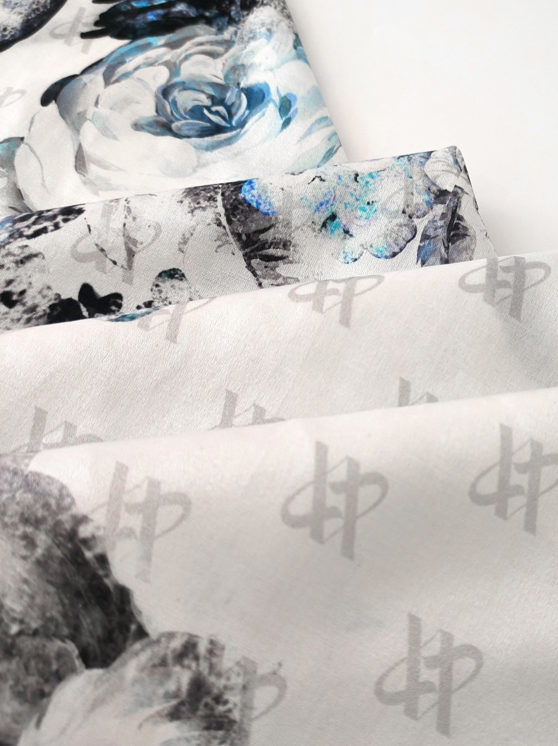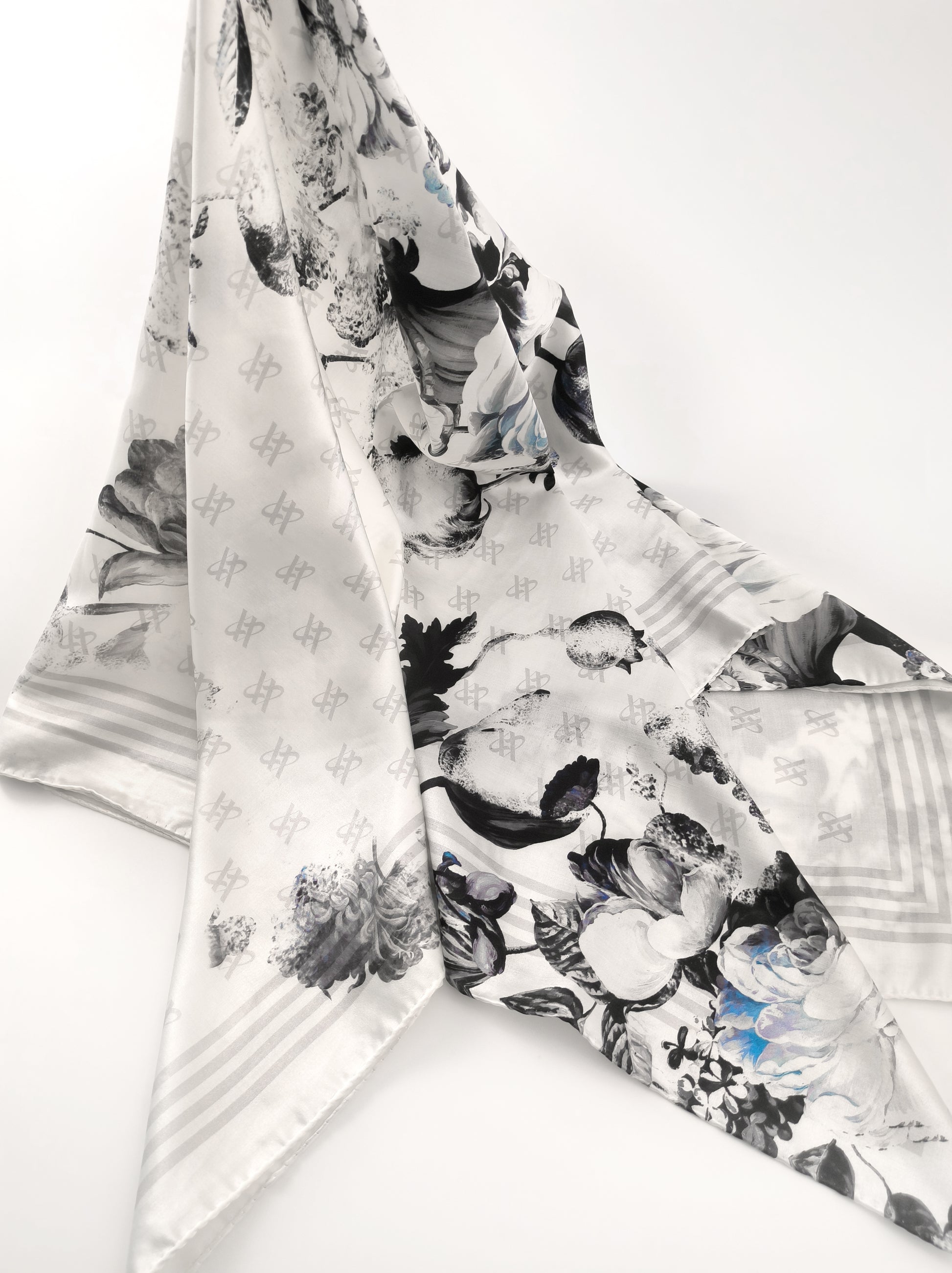 Rose Emblem Print Scarf – Grey & Blue – Silk Wool Modal Blend